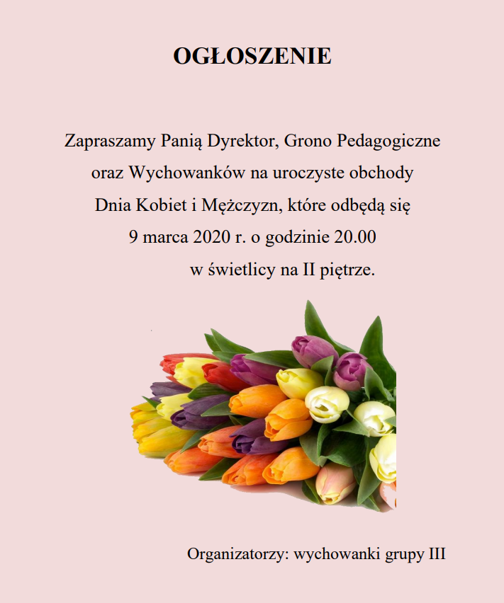 Grupa III serdecznie zaprasza na spotkanie z okazji Dnia kobiet i Mężczyzn. Szczegóły na plakacie poniżej.