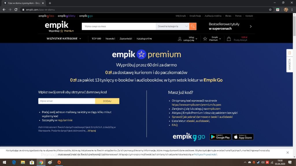 Aby umilić nam narodową kwarantannę, sieć Empik.com proponuje korzystanie ze swojej aplikacji całkowicie za darmo przez 60 dni. Do wyboru znajdziecie wiele e-booków oraz audiobooków. Wystarczy pobrać aplikację przez App Store lub Google Play, aby w pełni cieszyć się możliwością obcowania z książką, mimo zamkniętych bibliotek 🙂