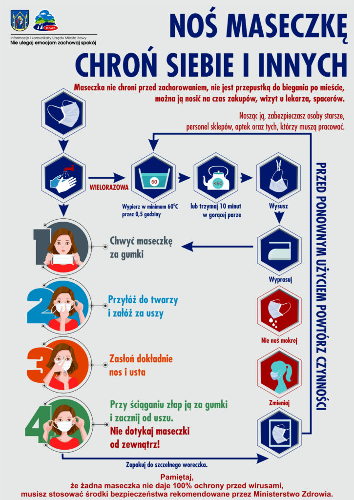 *użytą maskę należy traktować jako skażoną wirusem – maski jednorazowe wyrzucić do pojemnika na śmieci, maskę materiałową wyprać w wysokiej temperaturze z dodatkiem detergentu, przechowywać w opakowaniu zabezpieczającym przed kontaktem z nią innych osób, dbać o higienę rąk.