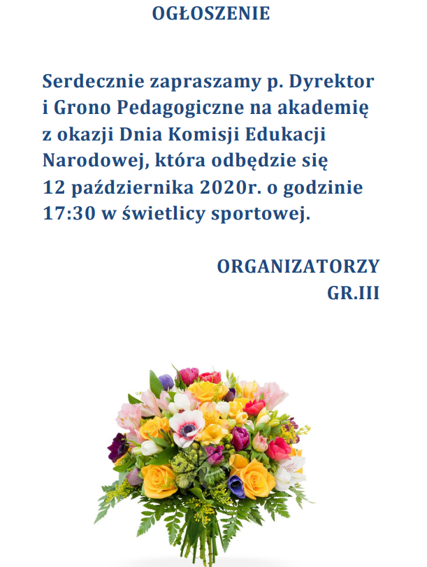 Grupa III zaprasza na akademię z okazji Dnia Komisji Edukacji Narodowej. Szczegóły podano poniżej.