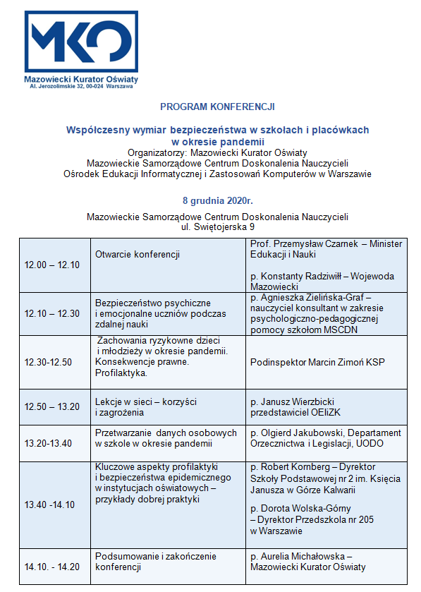 Mazowiecki Wicekurator Oświaty serdecznie zaprasza na konferencję on-line pt. „Współczesny wymiar bezpieczeństwa w szkołach i placówkach w okresie pandemii”. Konferencja odbywać się będzie 8 grudnia 2020 w godzinach 12.00-14.00 i dostępna będzie tutaj