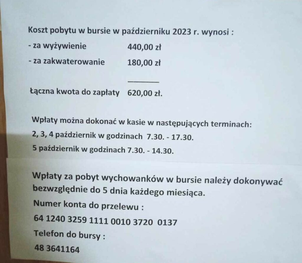 Na zdjęciu poniżej szczegóły opłaty za bursę. Prosimy o terminowe wpłaty.