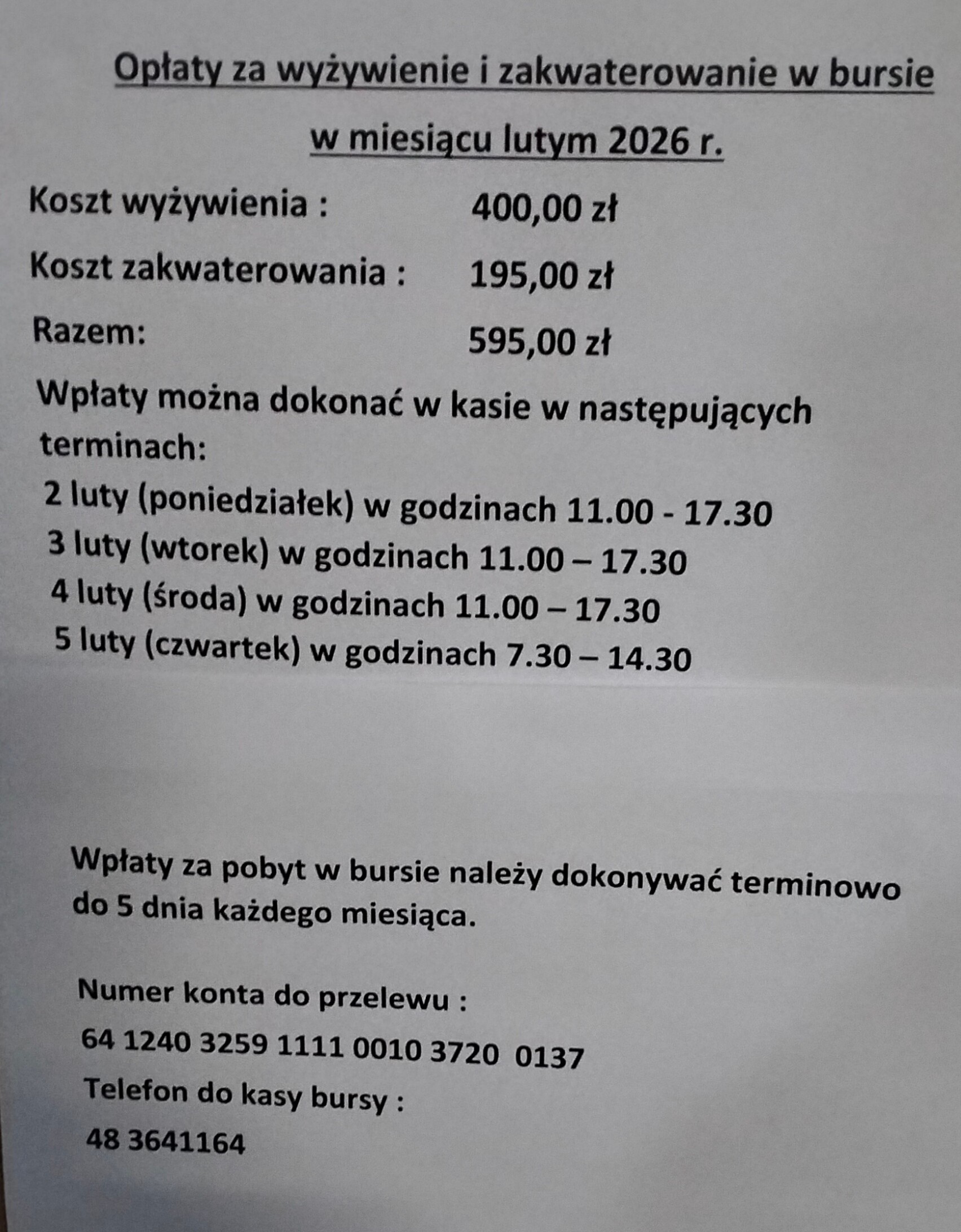 Poniżej znajdują się informacje dotyczące wpłat za luty. Prosimy o pilnowanie terminu.