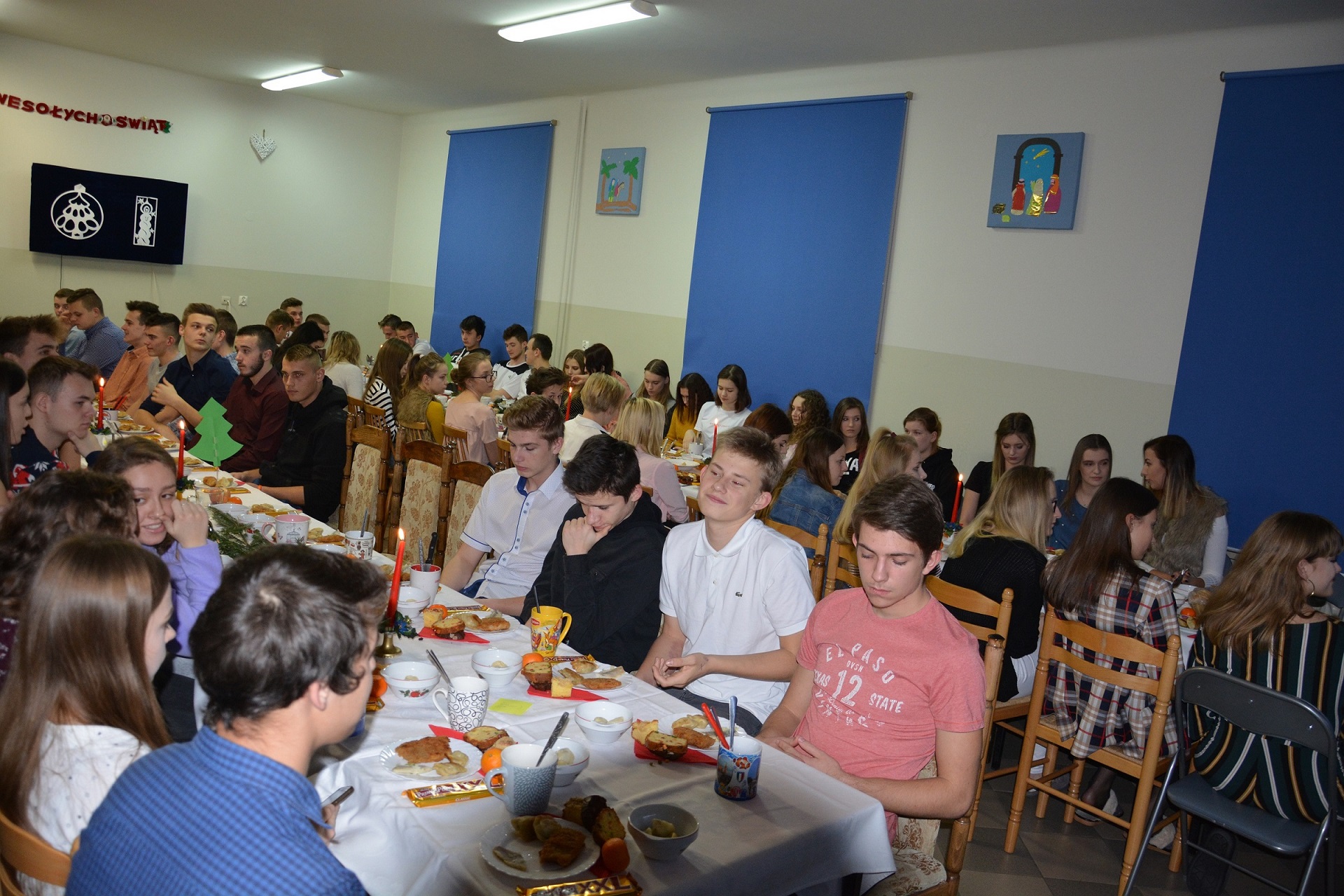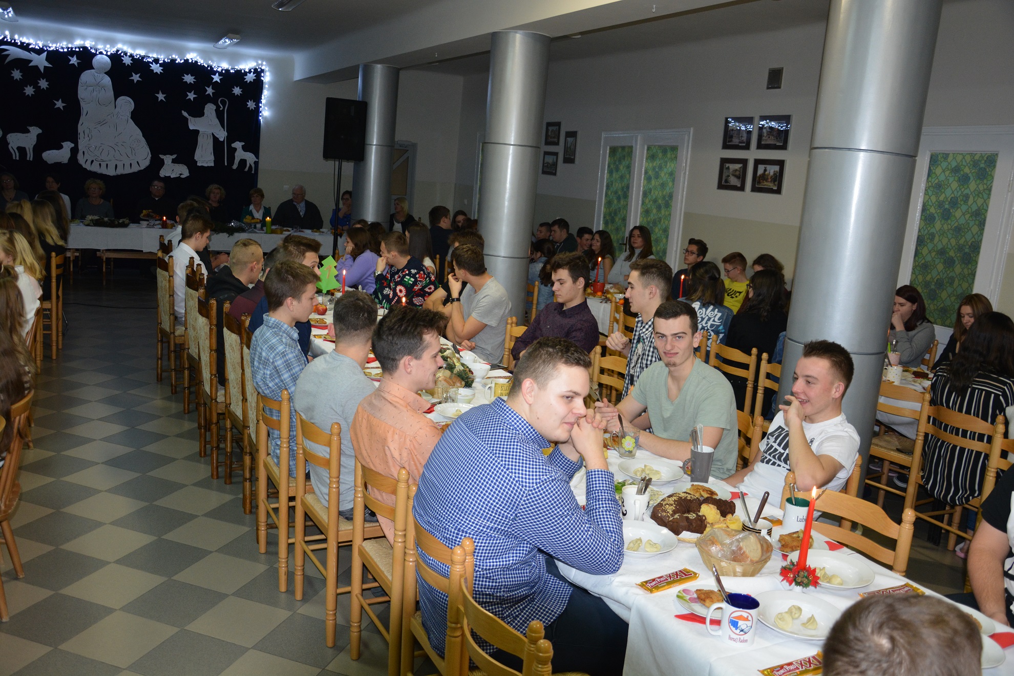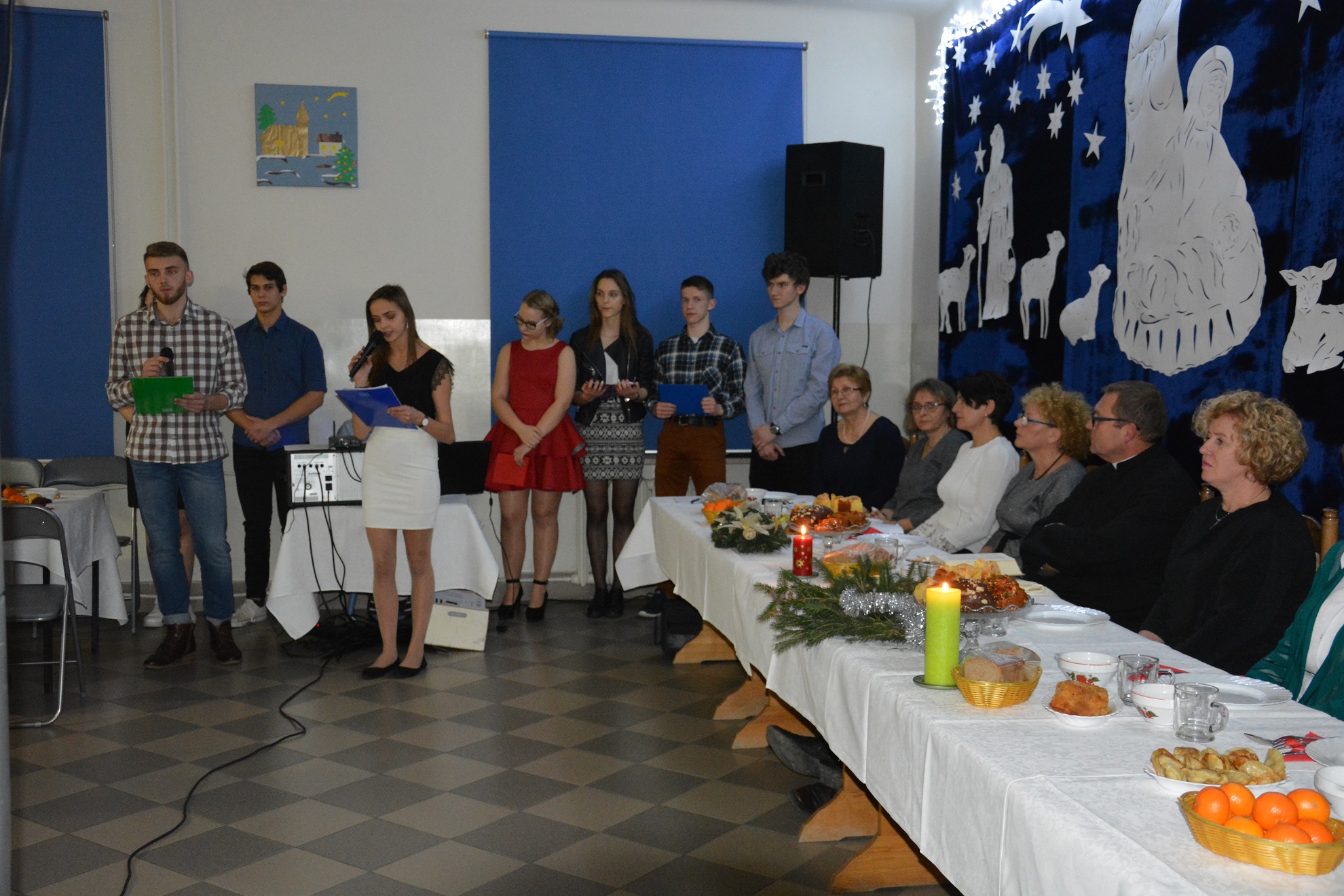 13 grudnia o godz. 18.45 wszyscy wychowankowie przybyli na uroczystą kolację. Wieczór wigilijny rozpoczął się od wysłuchania programu artystycznego wykonanego przez naszą młodzież, który został przygotowany pod kierunkiem wychowawców grupy I i II. Wieczór ten uświetnił swoją obecnością proboszcz parafii Matki Bożej Bolesnej ks. Gabriel Marciniak, który odczytał fragment Ewangelii o narodzeniu Chrystusa oraz wygłosił pasjonującą przemowę o miłości i dobroci do drugiego człowieka.
