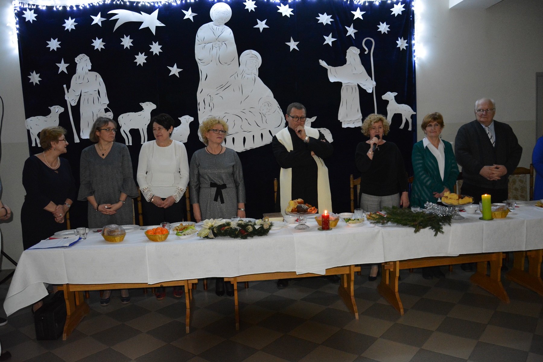 Nie zabrakło ciepłych słów oraz świątecznych życzeń od dyrektor p. Ewy Kwiatkowskiej. Na koniec odbyło się uroczyste łamanie opłatkiem, po którym wszyscy zasiedli do wieczerzy wigilijnej. Na stole pojawiły się tradycyjne potrawy: barszczyk czerwony z uszkami, ryba, pierogi z kapustą i grzybami, kompot z suszu, ciasta oraz owoce.