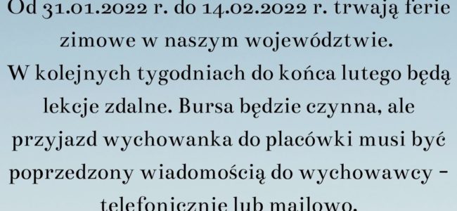 W związku z wprowadzeniem po feriach zimowych nauki zdalnej oraz możliwości konsultacji maturalnych bądź zajęć warsztatowych infomujemy, że bursa będzie otwarta dla naszych wychowanków. Godziny pracy wychowawców będą zależne od liczby młodzieży, w związku z tym, każdy planowany przyjazd po feriach musi zostać uprzednio ustalony z wychowawcą. Przypominamy mail do wychowawców: wychowawcybursy3@gmail.com