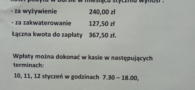 Opłata za cały miesiąc korzystania z Bursy to 490 zł. Uwaga: 12.11.2021 w związku z liczną nieobecnością młodzieży, nie będą serwowane posiłki.